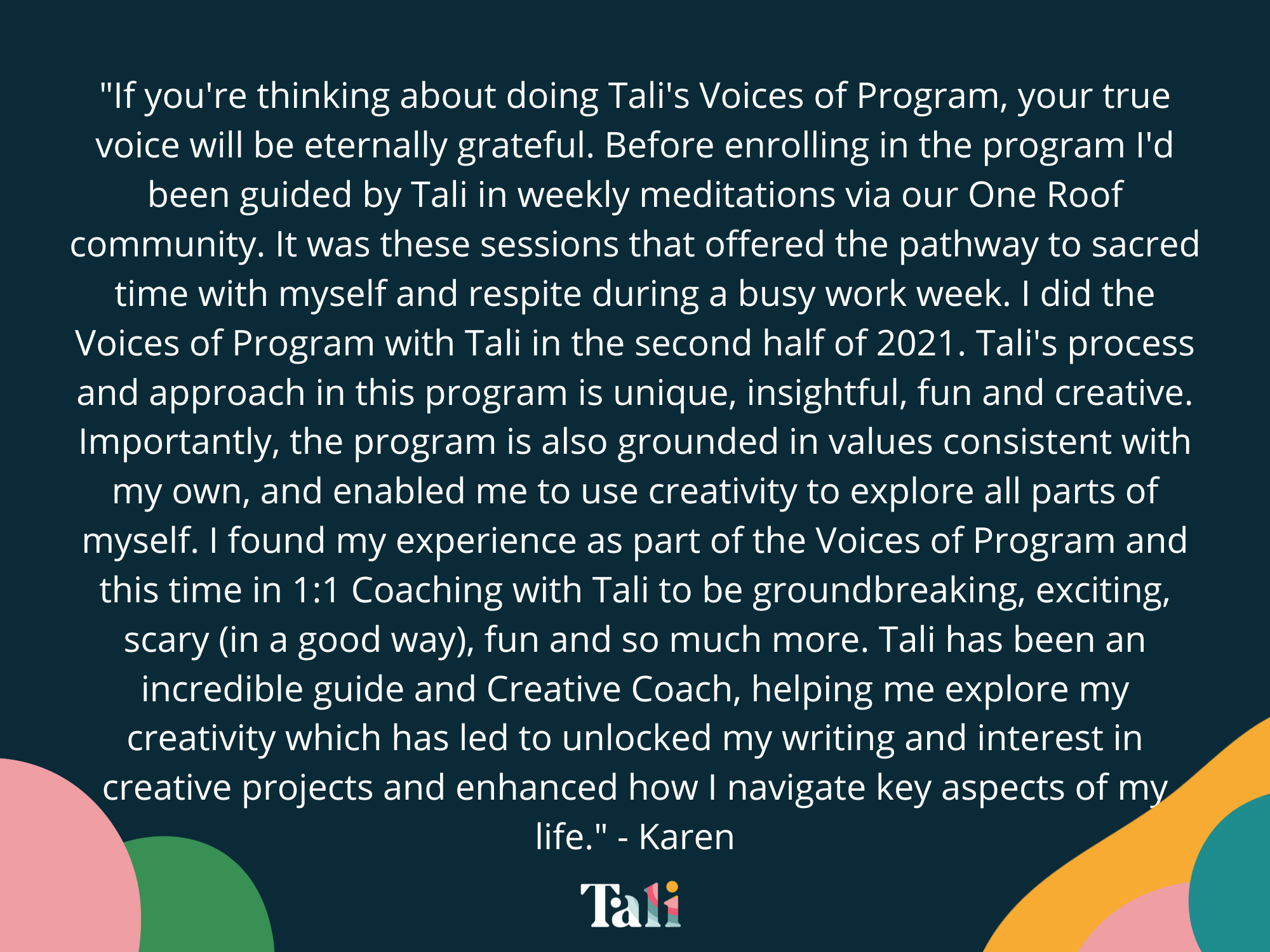 Each week you will receive an email with videos from Tali to guide you through the work. You will be expected to do the work each week and have it completed before the following week's group coaching call. There will be music playlists, meditations, PDF resources and journal prompts sent to you.